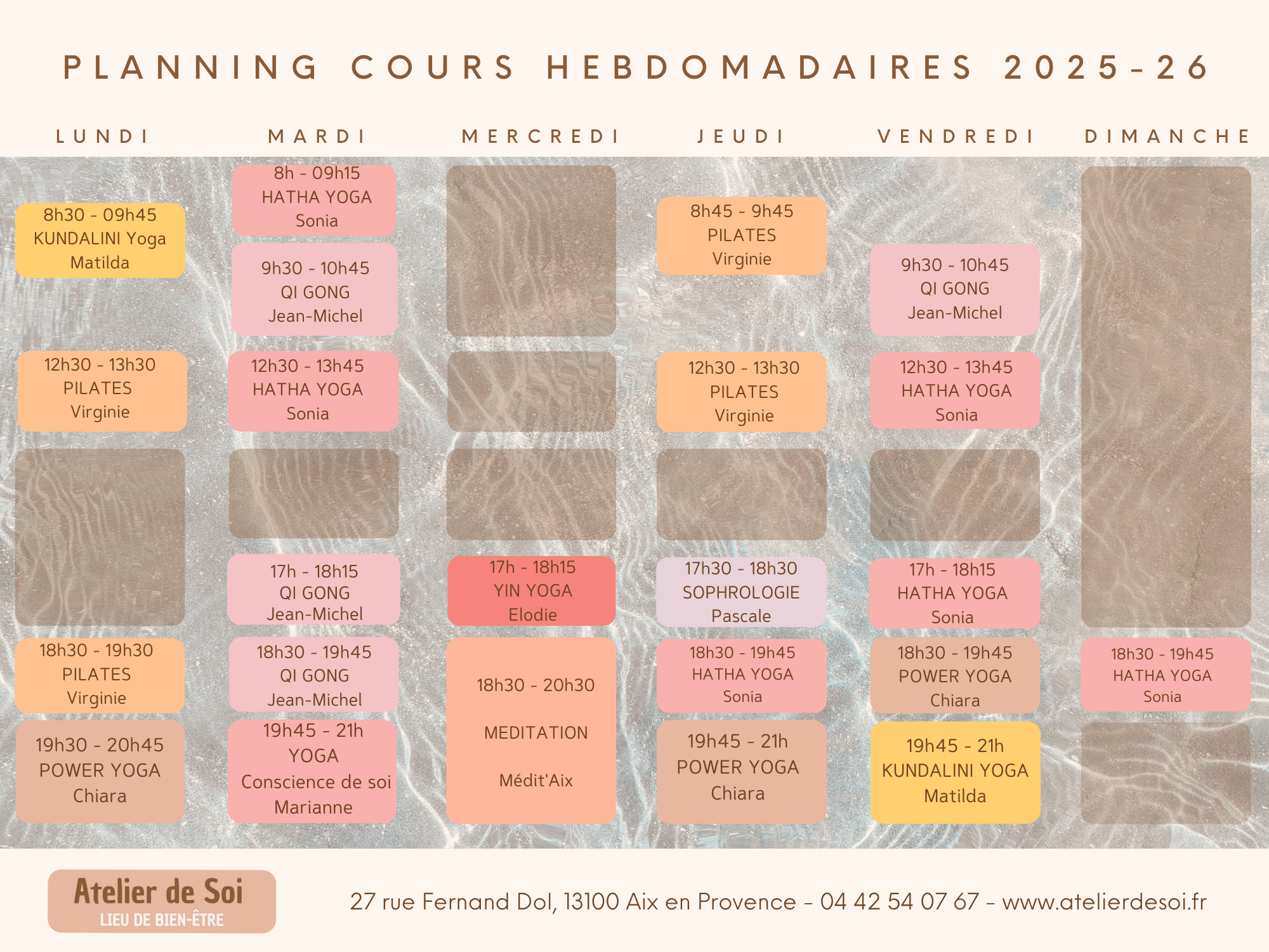 L'Atelier de soi est un centre dédié à l'art de la relaxation et du bien-être pour tous, au travers des pratiques orientales comme le Qi Gong et le Yoga, ainsi que par de nombreuses approches en développement personnel. Nous proposons ainsi des cours hebdomadaires, des ateliers, et des soins individuels.