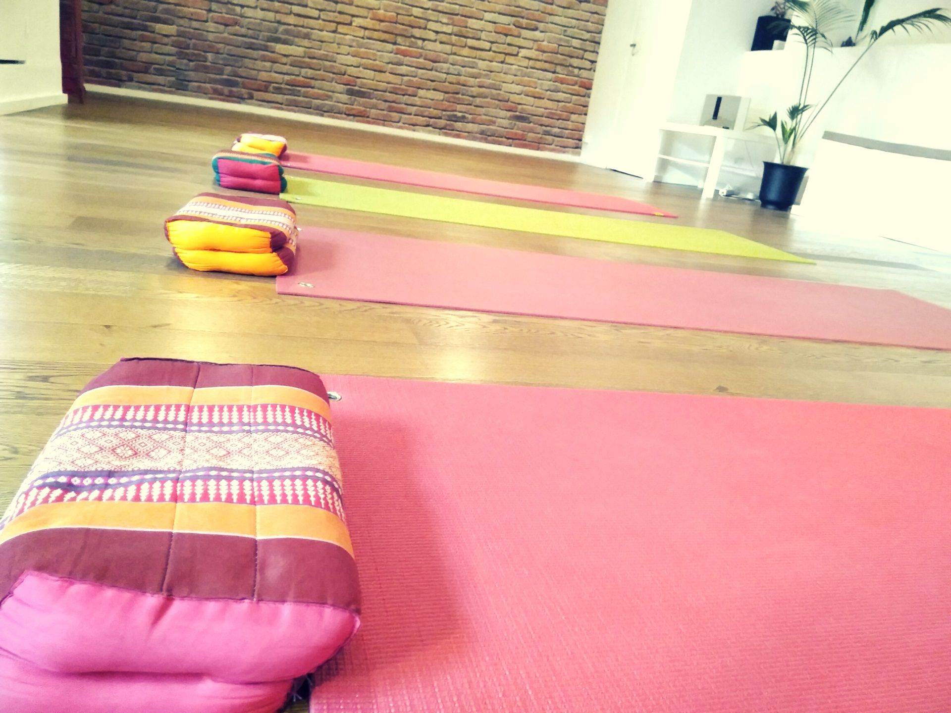 Notre salle de pratique est munie de tout le matériel nécessaire : tapis, briques, élastiques, ballons de pilates, bolsters, coussins de méditation, tapis de Wuo-Taï, vidéo-projecteur, chaises...
